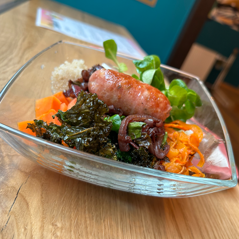 Feldsalat, hausgemachter Apfel-Möhrensalat, Tomaten und Gurken bilden die Grundlage und werden durch Feta, Granatapfel und Butterbrot-Crumbles zu einem einzigartigen Geschmackserlebnis.