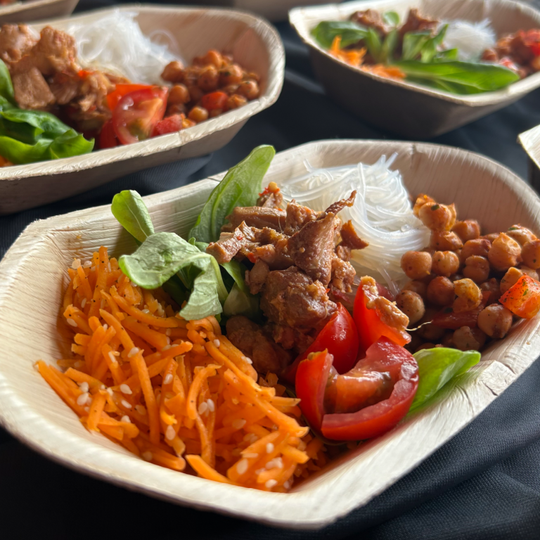 Feldsalat, Edamame, Tomaten, Gurken und der hausgemachte Apfel-Möhren-Salat ergänzen den leichten Charakter der Bowl und garantieren die kohlenhydratarme Ernährung.