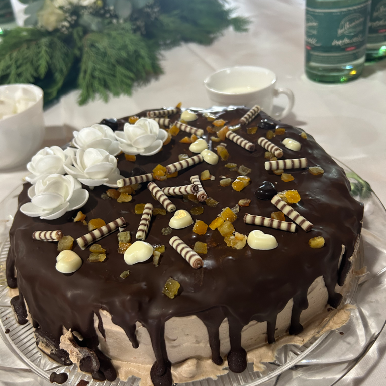 Auf dem Bild seht Ihr eine Schokotorte mit Orangenfüllung und Whisky-Sahne-Topping.